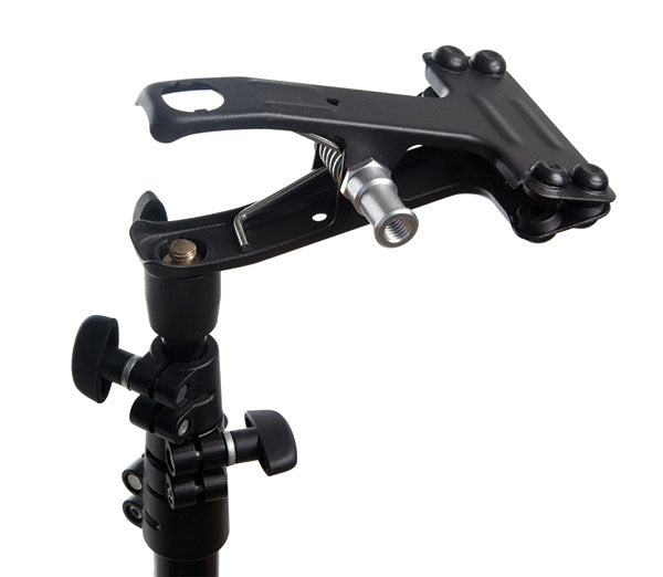 The Phottix Clip Clamp provides an hand to hold umbrellas, battery packs, backdrops and whatever else you can think of. The clip clamp attaches to a light stand with a 5/8” lug or 3/8″ threaded male insert. It is sturdy, made from solid metal and moulded plastic, so it can reliably hold heavier or awkwardly balanced objects.